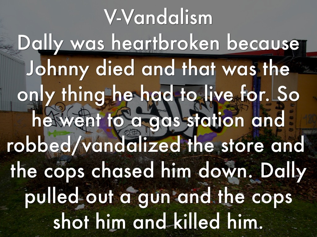 V-Vandalism Dally was heartbroken because Johnny died and that was the only thing he had to live for. So he went to a gas station and robbed/vandalized the store and the cops chased him down. Dally pulled out a gun and the cops shot him and killed him.
