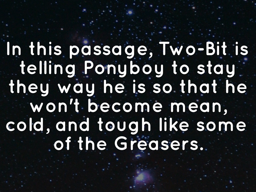 In this passage, Two-Bit is telling Ponyboy to stay they way he is so that he won't become mean, cold, and tough like some of the Greasers.
