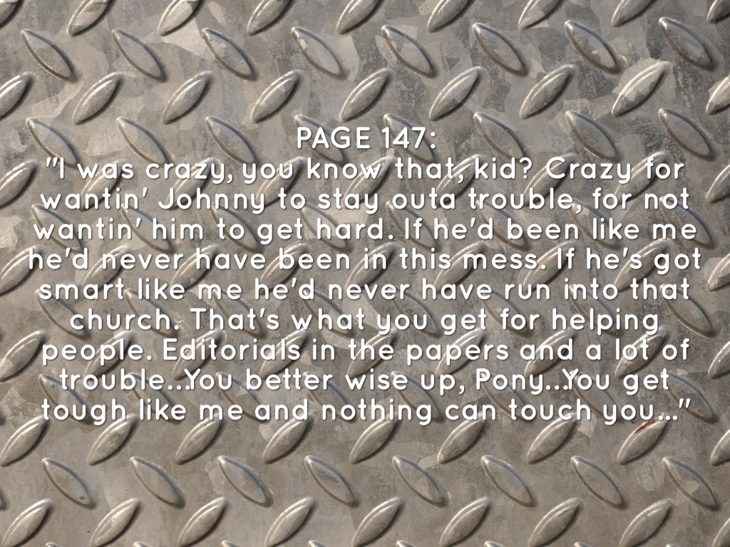 "I was crazy, you know that, kid? Crazy for wantin' Johnny to stay outa trouble, for not wantin' him to get hard. If he'd been like me he'd never have been in this mess. If he's got smart like me he'd never have run into that church. That's what you get for helping people. Editorials in the papers and a lot of trouble…You better wise up, Pony…You get tough like me and nothing can touch you..."