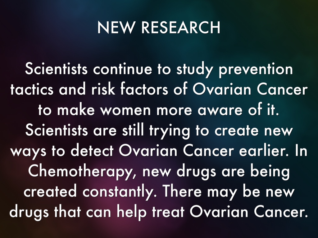 Scientists continue to study prevention tactics and risk factors of Ovarian Cancer to make women more aware of it. Scientists are still trying to create new ways to detect Ovarian Cancer earlier. In Chemotherapy, new drugs are being created constantly. There may be new drugs that can help treat Ovarian Cancer.