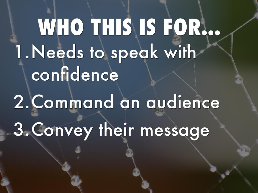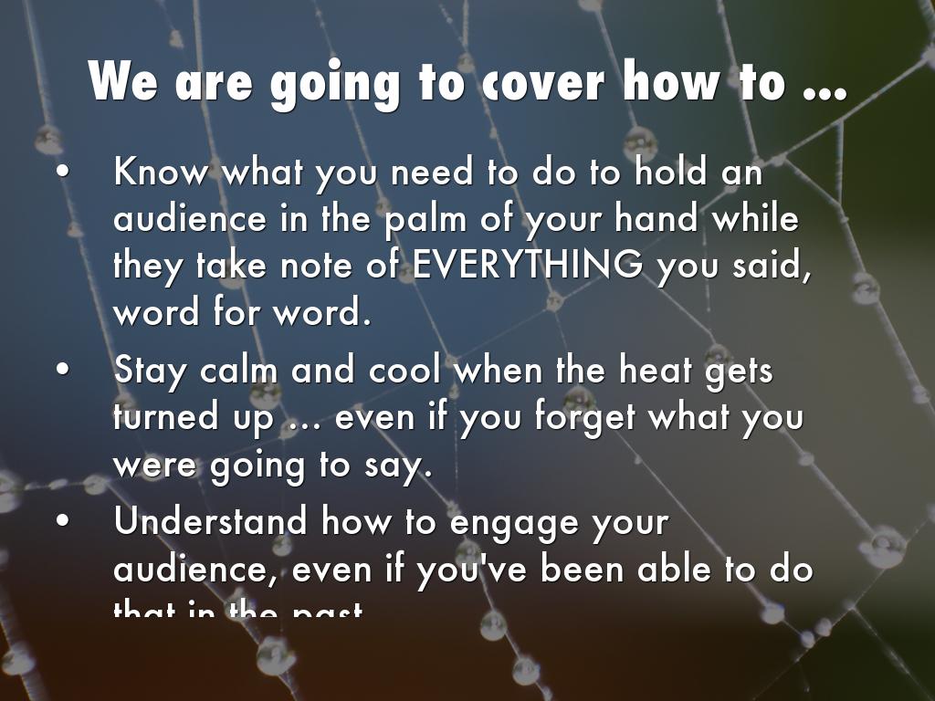 - Know what you need to do to hold an audience in the palm of your hand while they take note of EVERYTHING you said, word for word.
