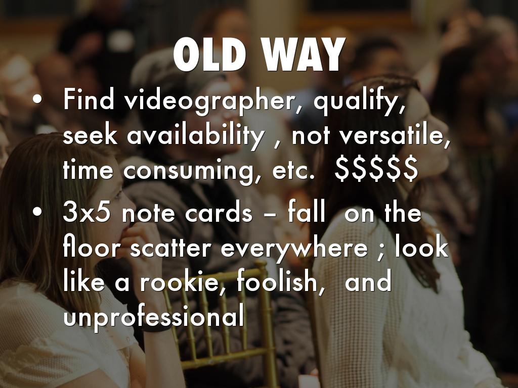 - Find videographer, qualify, seek availability , not versatile, time consuming, etc. $$$$$