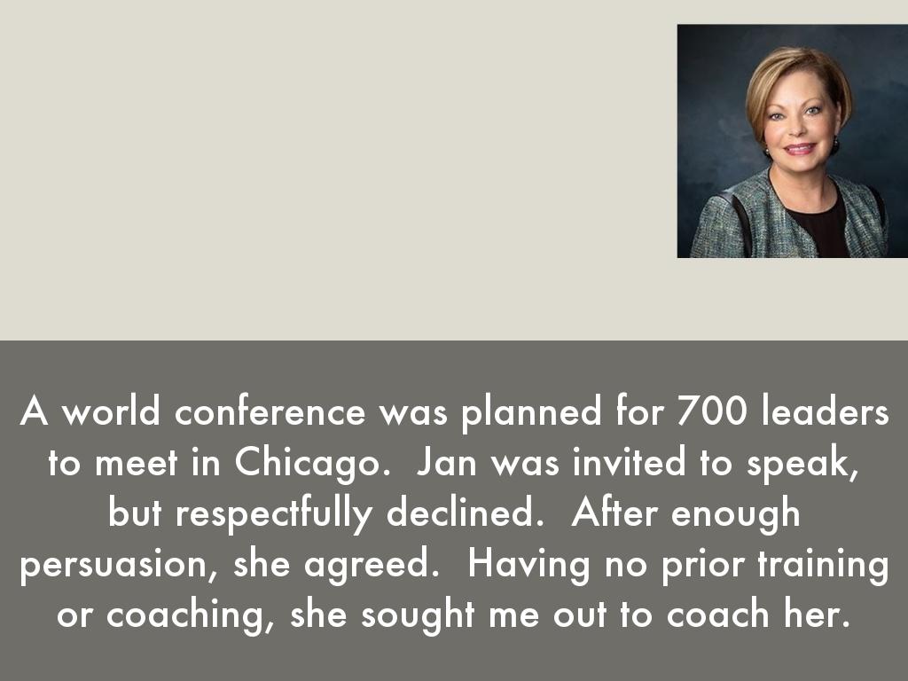 A world conference was planned for 700 leaders to meet in Chicago. Jan was invited to speak, but respectfully declined. After enough persuasion, she agreed. Having no prior training or coaching, she sought me out to coach her.