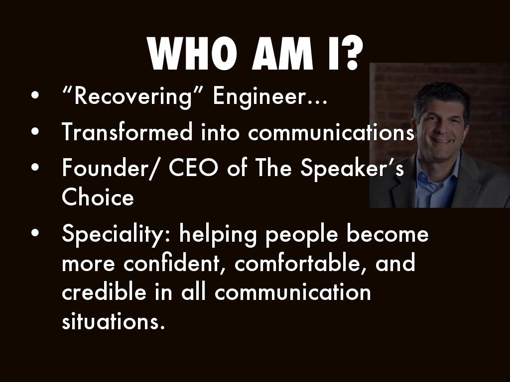 - Speciality: helping people become more confident, comfortable, and credible in all communication situations.