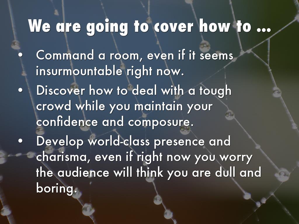 - Develop world-class presence and charisma, even if right now you worry the audience will think you are dull and boring.