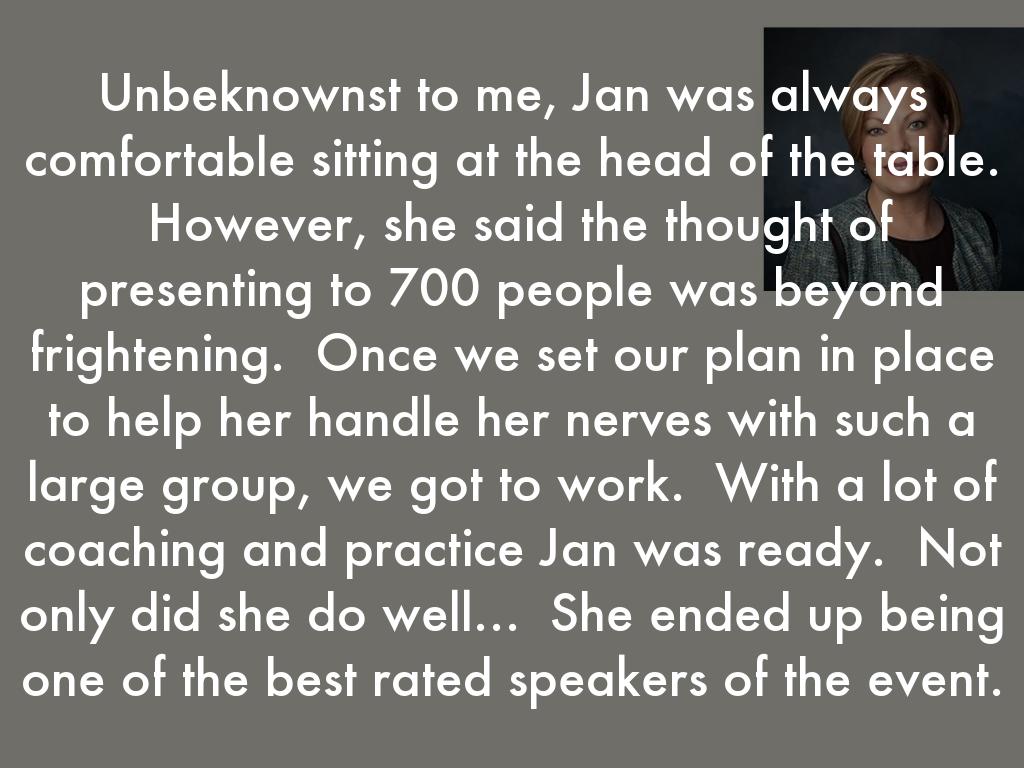 Unbeknownst to me, Jan was always comfortable sitting at the head of the table. However, she said the thought of presenting to 700 people was beyond frightening. Once we set our plan in place to help her handle her nerves with such a large group, we got to work. With a lot of coaching and practice Jan was ready. Not only did she do well… She ended up being one of the best rated speakers of the event.