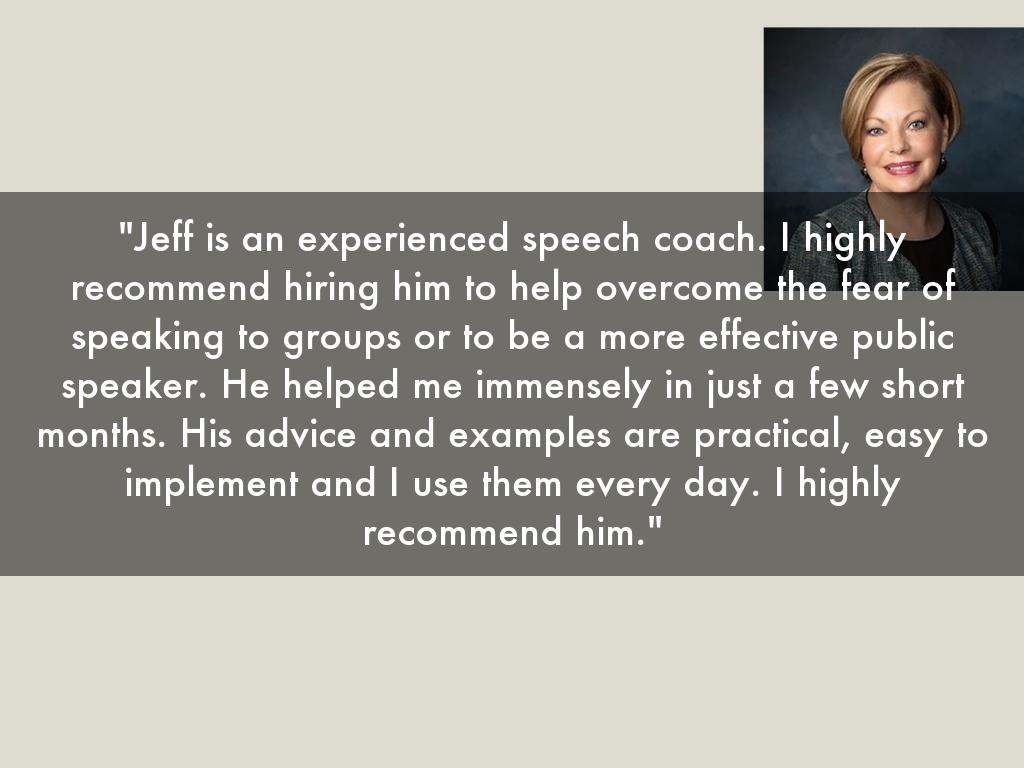 "Jeff is an experienced speech coach. I highly recommend hiring him to help overcome the fear of speaking to groups or to be a more effective public speaker. He helped me immensely in just a few short months. His advice and examples are practical, easy to implement and I use them every day. I highly recommend him."