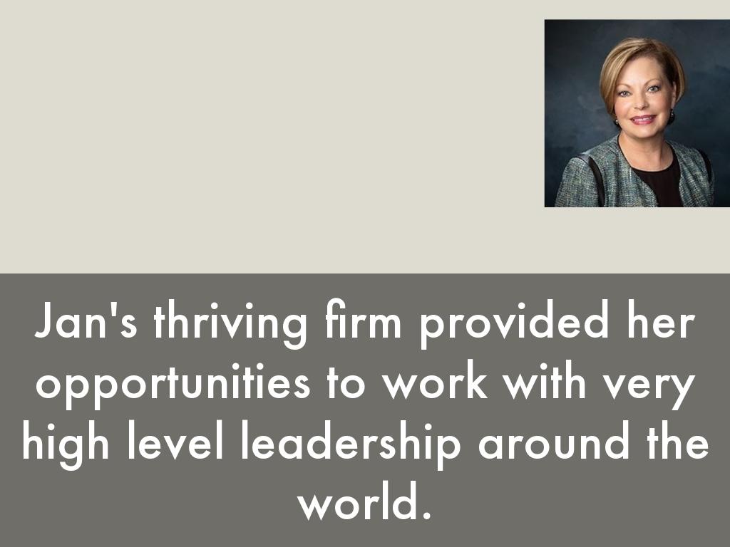 Jan's thriving firm provided her opportunities to work with very high level leadership around the world.