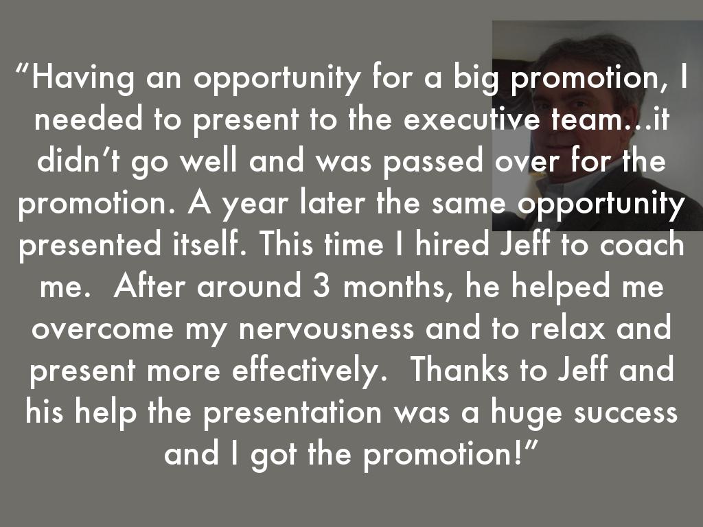 “Having an opportunity for a big promotion, I needed to present to the executive team…it didn’t go well and was passed over for the promotion. A year later the same opportunity presented itself. This time I hired Jeff to coach me. After around 3 months, he helped me overcome my nervousness and to relax and present more effectively. Thanks to Jeff and his help the presentation was a huge success and I got the promotion!”