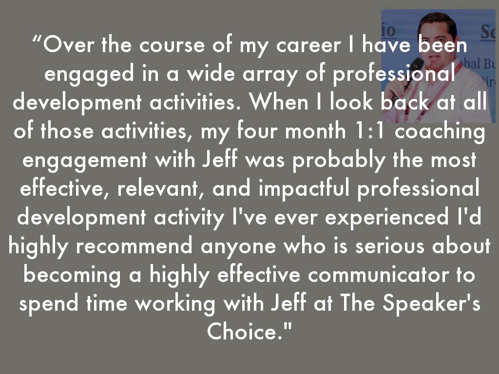 “Over the course of my career I have been engaged in a wide array of professional development activities. When I look back at all of those activities, my four month 1:1 coaching engagement with Jeff was probably the most effective, relevant, and impactful professional development activity I've ever experienced I'd highly recommend anyone who is serious about becoming a highly effective communicator to spend time working with Jeff at The Speaker's Choice."