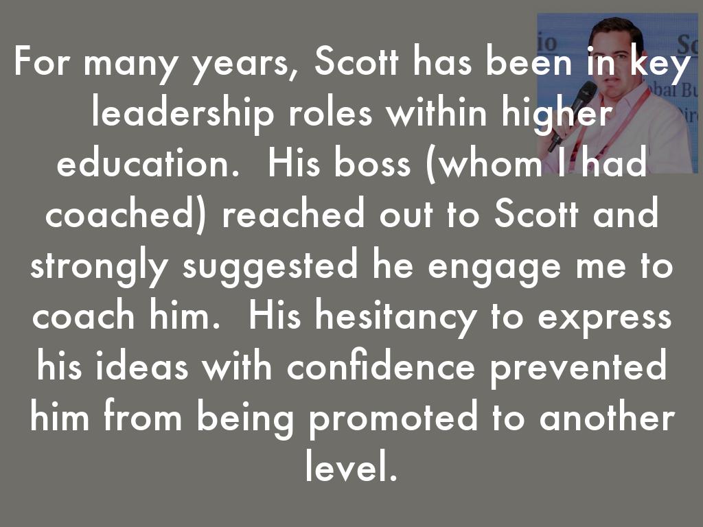 For many years, Scott has been in key leadership roles within higher education. His boss (whom I had coached) reached out to Scott and strongly suggested he engage me to coach him. His hesitancy to express his ideas with confidence prevented him from being promoted to another level.