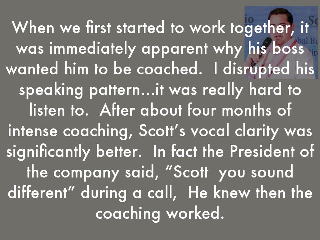 When we first started to work together, it was immediately apparent why his boss wanted him to be coached. I disrupted his speaking pattern…it was really hard to listen to. After about four months of intense coaching, Scott’s vocal clarity was significantly better. In fact the President of the company said, “Scott you sound different” during a call, He knew then the coaching worked.