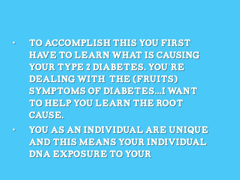 - To accomplish this you first have to learn what is causing your Type 2 diabetes. You're dealing with the (fruits) symptoms of diabetes...I want to help you learn the root cause.
