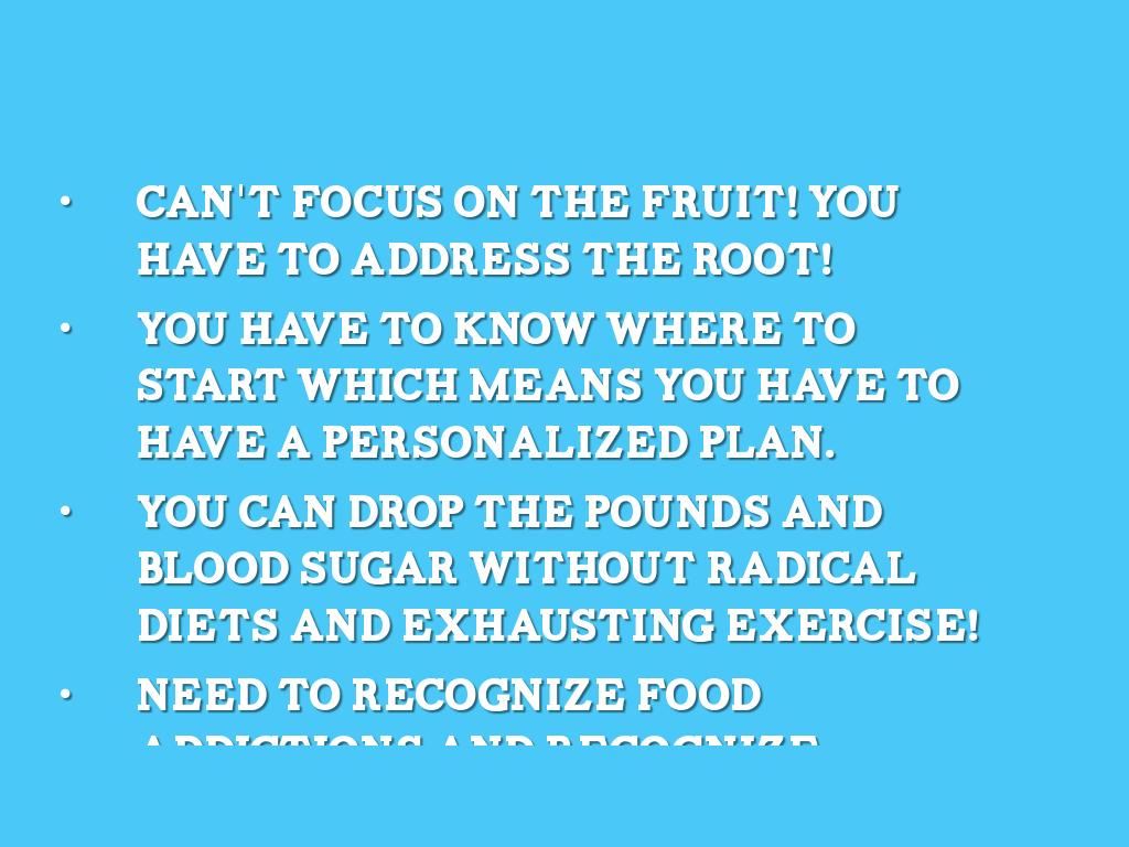 - need to recognize food addictions and recognize certain foods touted as healthy are actually bad for reversing diabetes.
