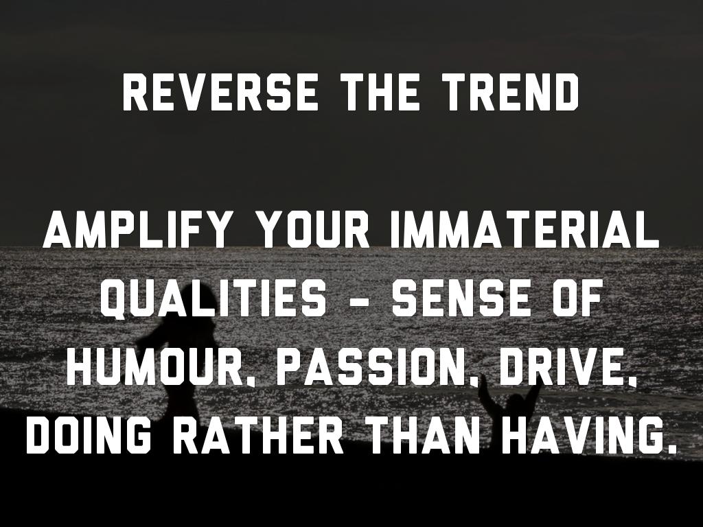 Amplify your immaterial qualities - sense of humour, passion, drive, doing rather than having.