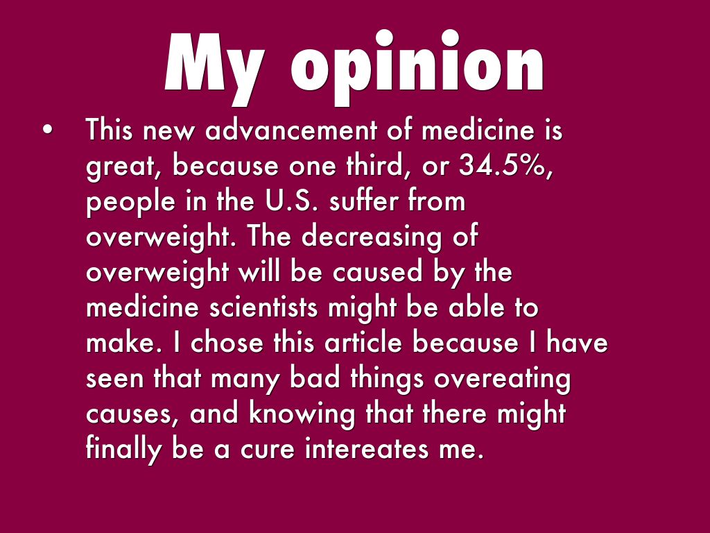 - This new advancement of medicine is great, because one third, or 34.5%, people in the U.S. suffer from overweight. The decreasing of overweight will be caused by the medicine scientists might be able to make. I chose this article because I have seen that many bad things overeating causes, and knowing that there might finally be a cure intereates me.