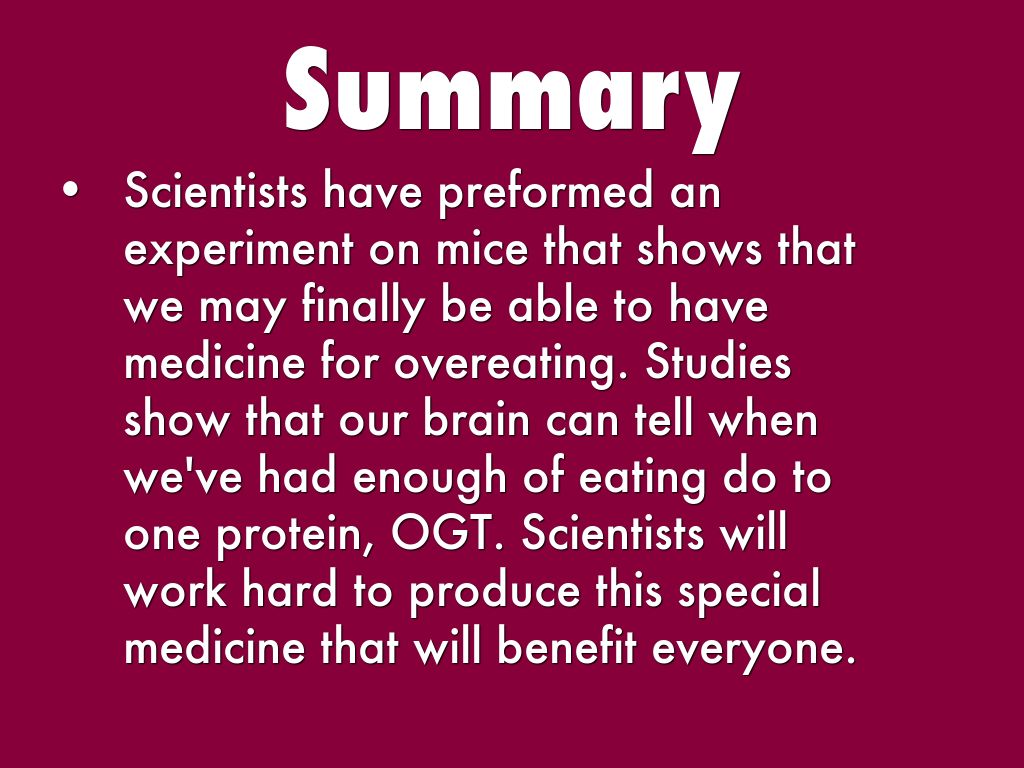 - Scientists have preformed an experiment on mice that shows that we may finally be able to have medicine for overeating. Studies show that our brain can tell when we've had enough of eating do to one protein, OGT. Scientists will work hard to produce this special medicine that will benefit everyone.