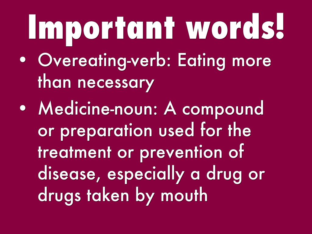 - Medicine-noun: A compound or preparation used for the treatment or prevention of disease, especially a drug or drugs taken by mouth