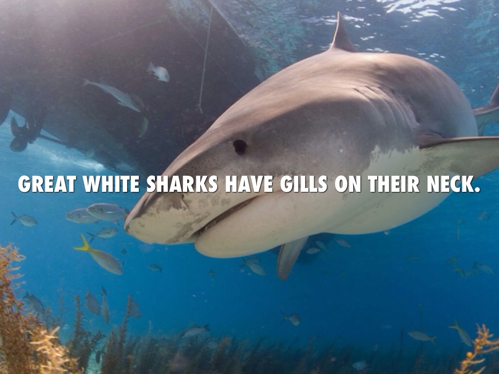 GREAT WHITE SHARKS HAVE GILLS ON THEIR NECK.