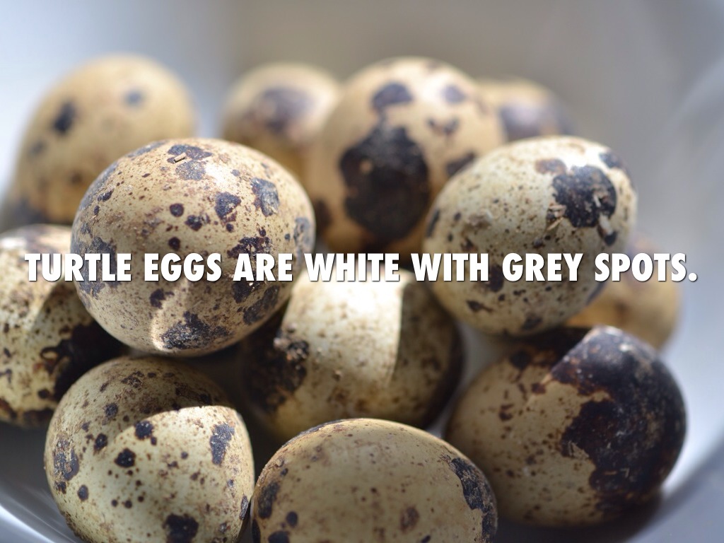 TURTLE EGGS ARE WHITE WITH GREY SPOTS.