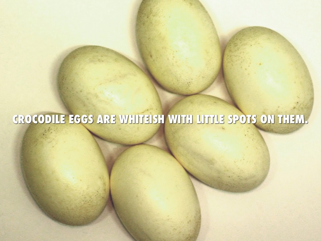 CROCODILE EGGS ARE WHITEISH WITH LITTLE SPOTS ON THEM.