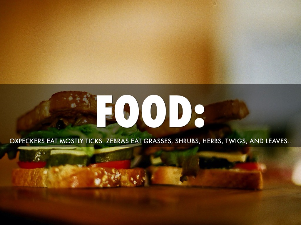 OXPECKERS EAT MOSTLY TICKS. ZEBRAS EAT GRASSES, SHRUBS, HERBS, TWIGS, AND LEAVES..