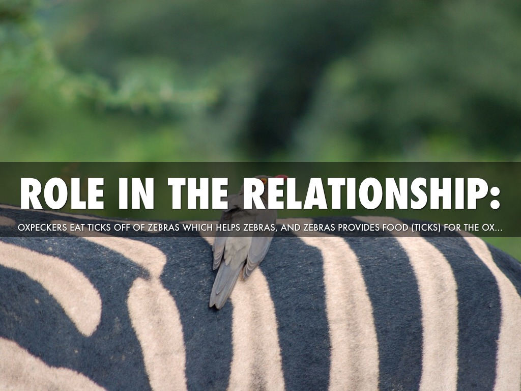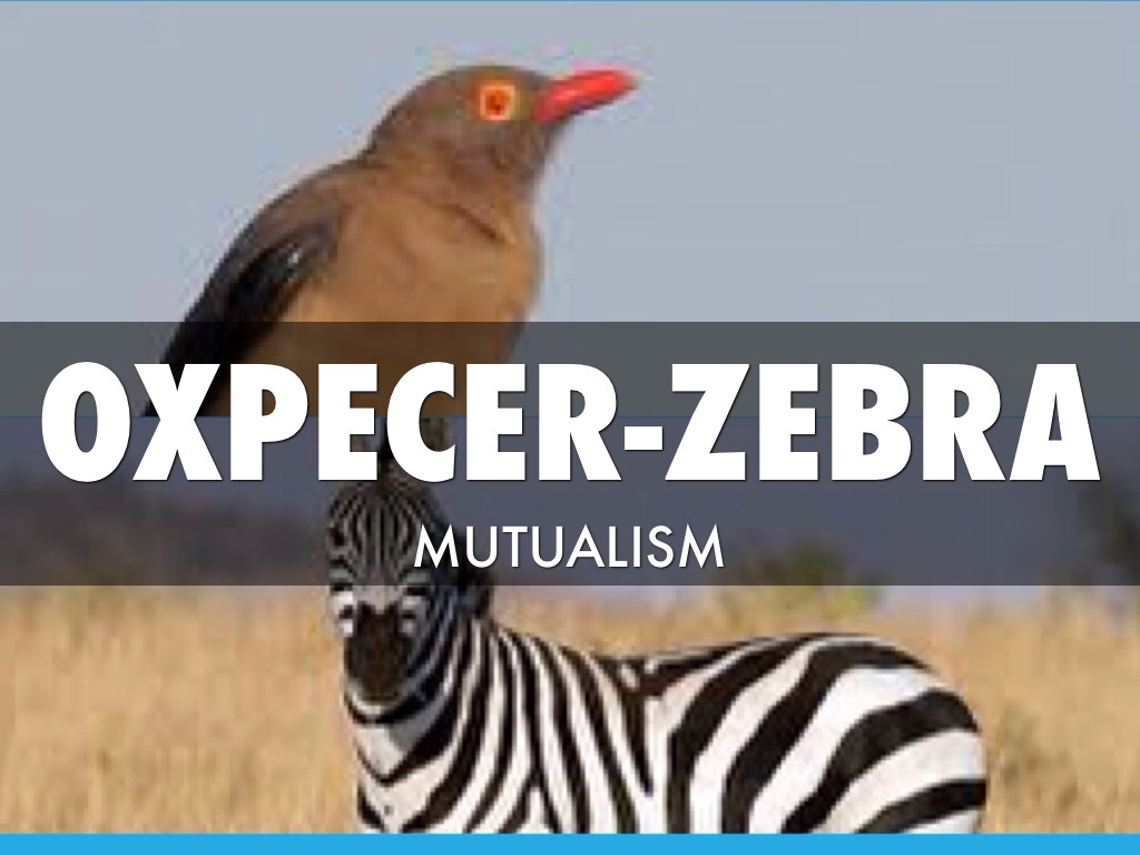 OXPECKERS EAT TICKS OFF OF ZEBRAS WHICH HELPS ZEBRAS, AND ZEBRAS PROVIDES FOOD (TICKS) FOR THE OXPECKER.