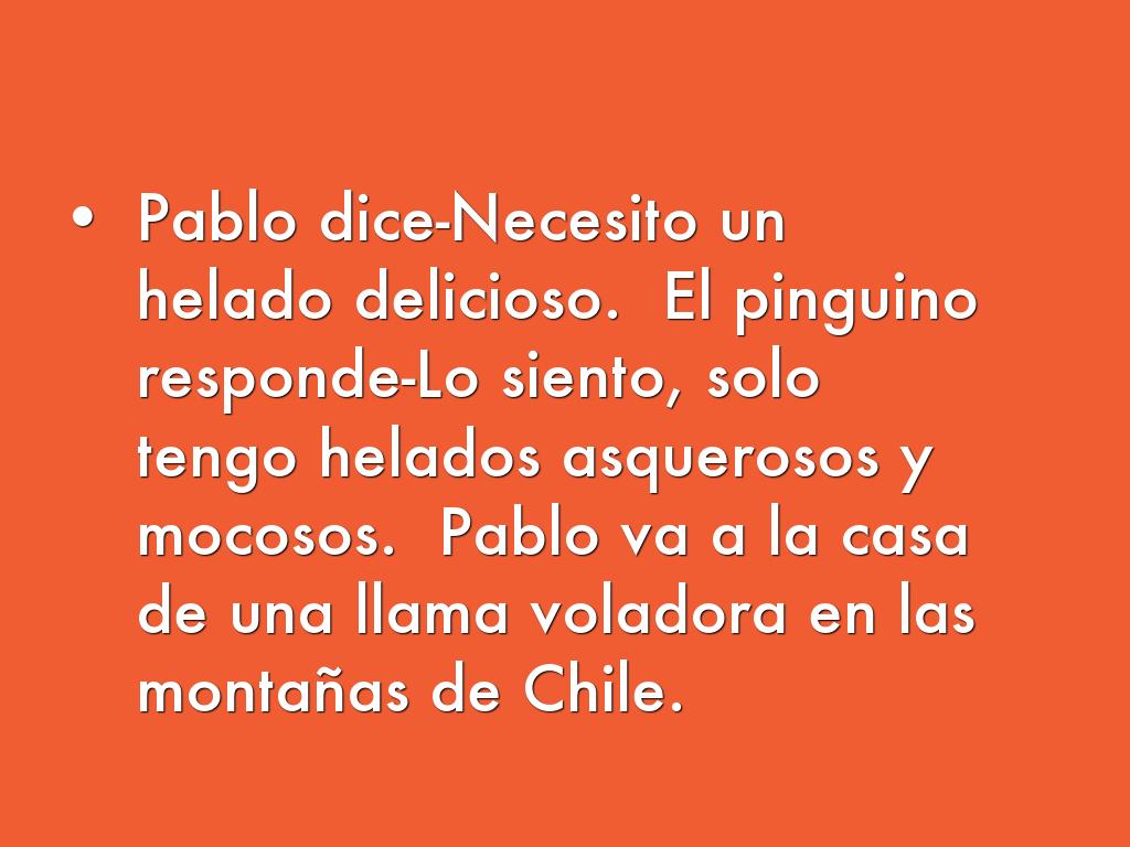 Pablo dice-Necesito un helado delicioso. El pinguino responde-Lo siento, solo tengo helados asquerosos y mocosos. Pablo va a la casa de una llama voladora en las montañas de Chile.