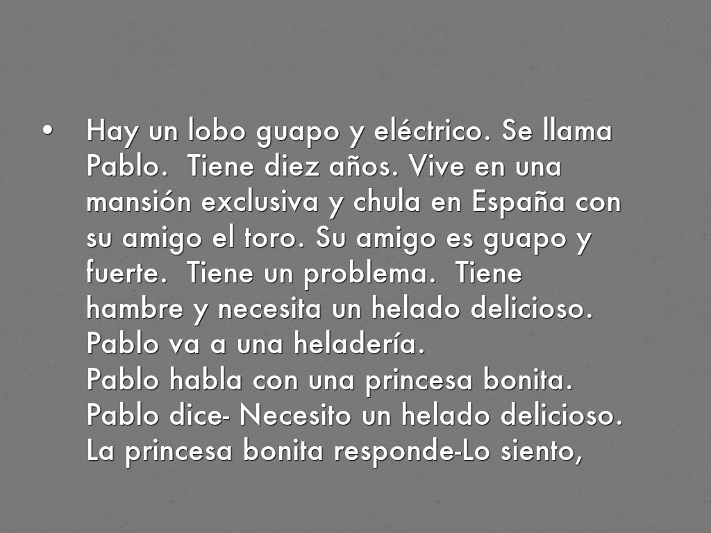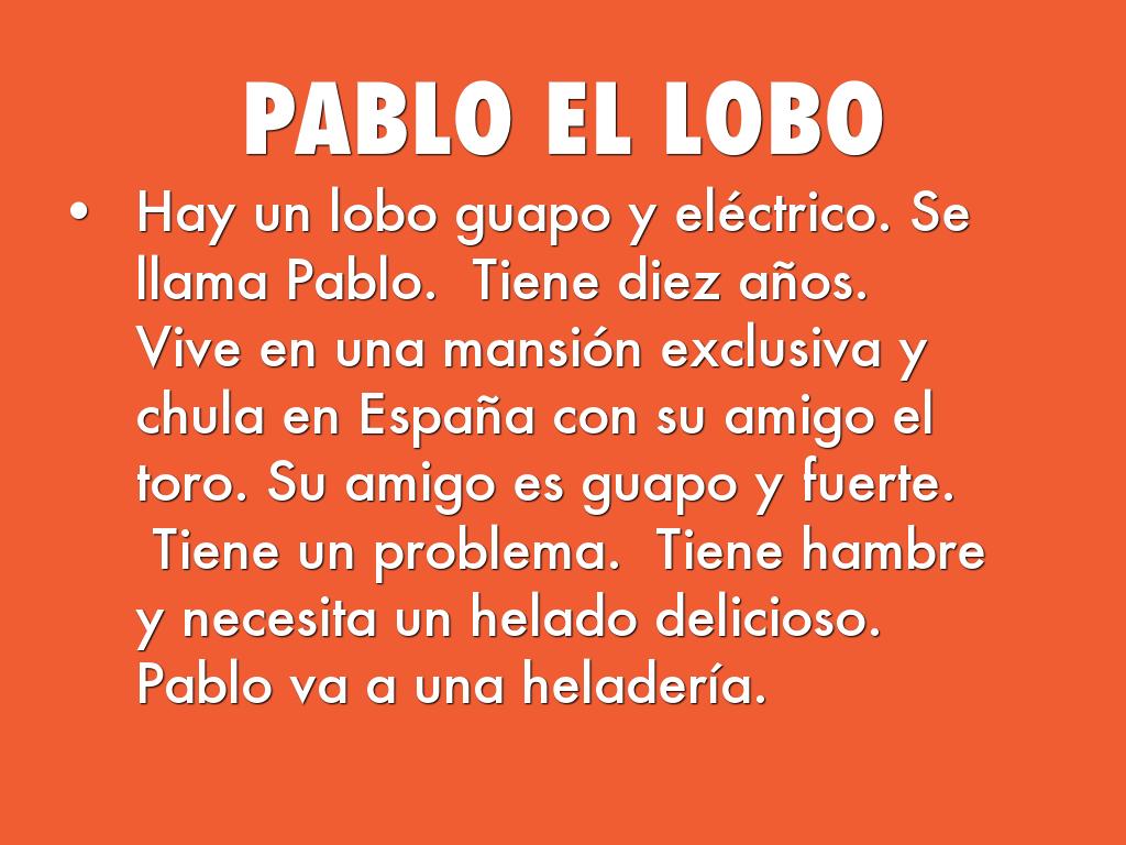 Hay un lobo guapo y eléctrico. Se llama Pablo. Tiene diez años. Vive en una mansión exclusiva y chula en España con su amigo el toro. Su amigo es guapo y fuerte. Tiene un problema. Tiene hambre y necesita un helado delicioso. Pablo va a una heladería.