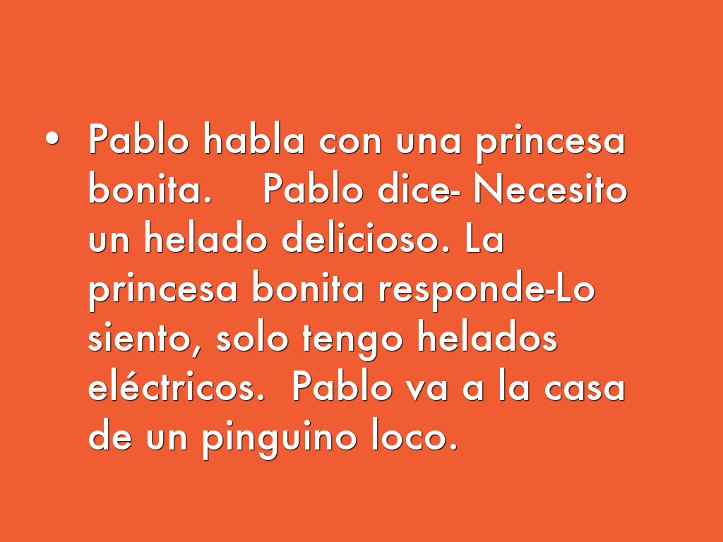 Pablo habla con una princesa bonita. Pablo dice- Necesito un helado delicioso. La princesa bonita responde-Lo siento, solo tengo helados eléctricos. Pablo va a la casa de un pinguino loco.