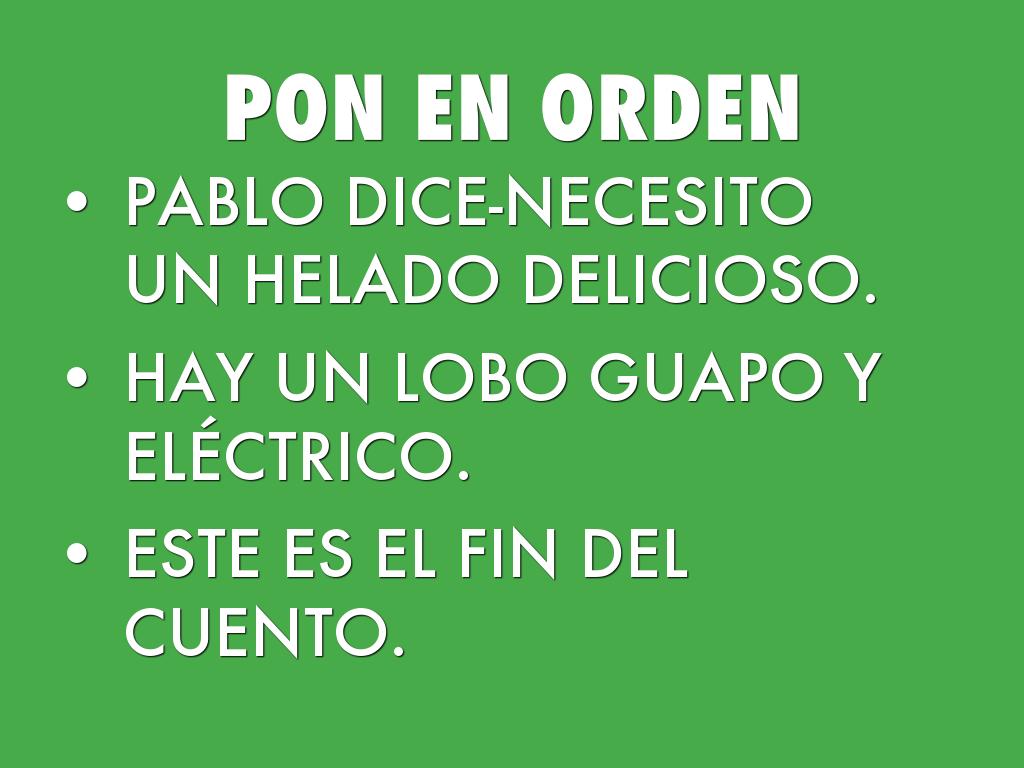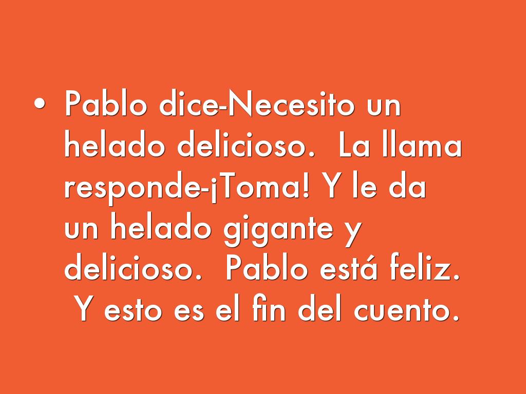 Pablo dice-Necesito un helado delicioso. La llama responde-¡Toma! Y le da un helado gigante y delicioso. Pablo está feliz. Y esto es el fin del cuento.
