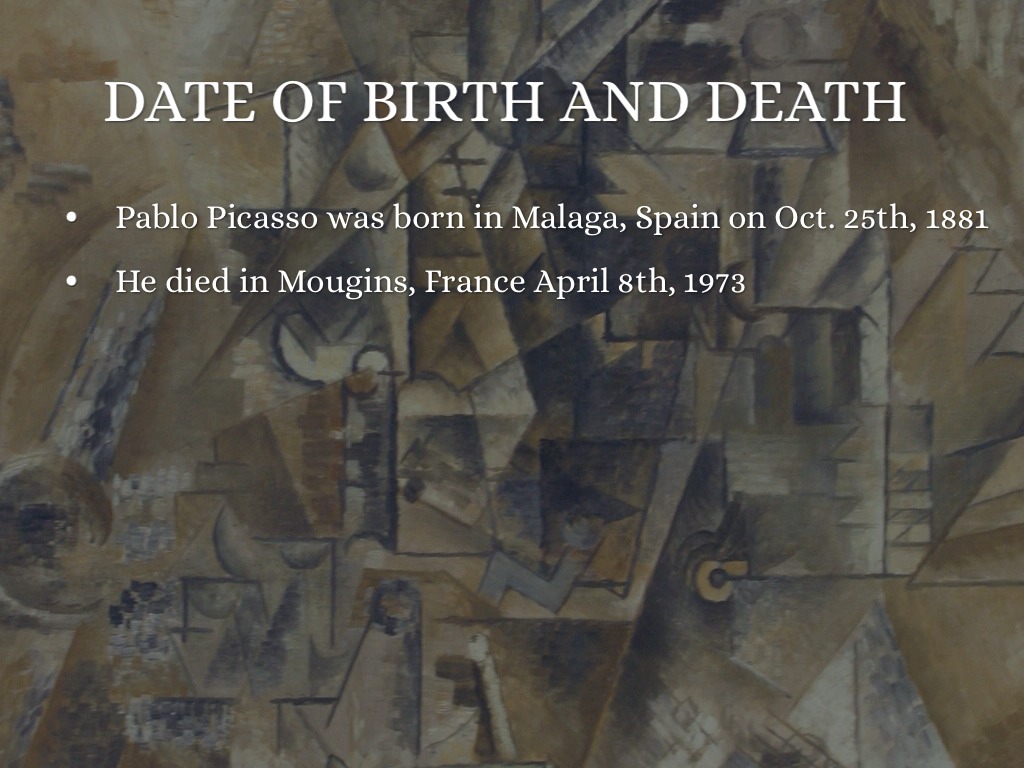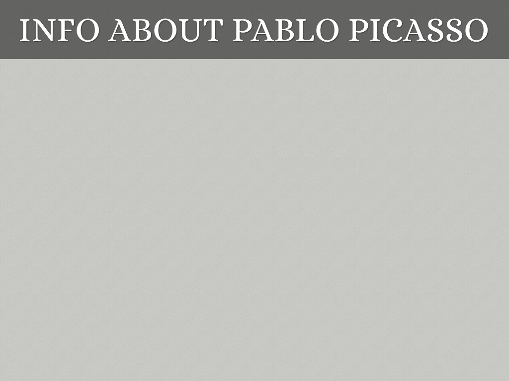Pablo Ruiz y Picasso is Pablo's full name. He did painting, sculpting, printmaking, Ceramicist, and a stage designer. Pablo and 2 other famous artist ( Henri Matisso, and Marcel Duchamp ) made these type of art making famous. When he was young he was exceptional at art when kids in his class did things in a month he did in a week at the age of 13 and at the age of 16 he went to royal Academy Of San Fernando. Pablo live between Paris and Barcelona in the 20th century. Picasso painted lots of paintings throughout 1903 to 1916. They are all mostly in museums.