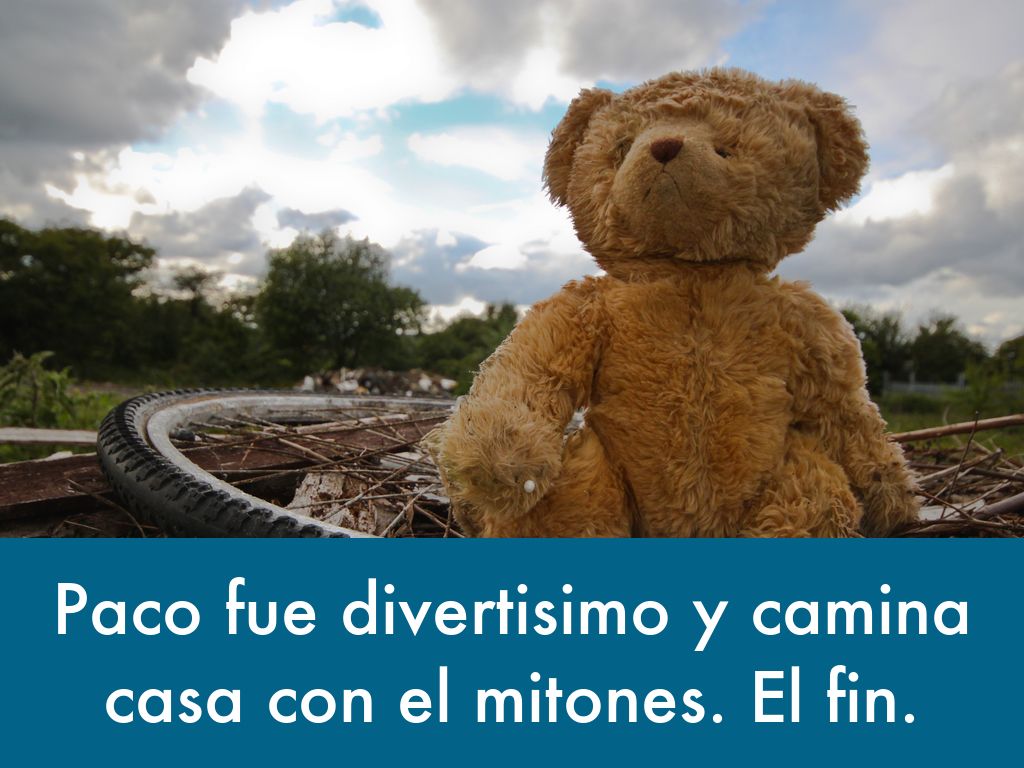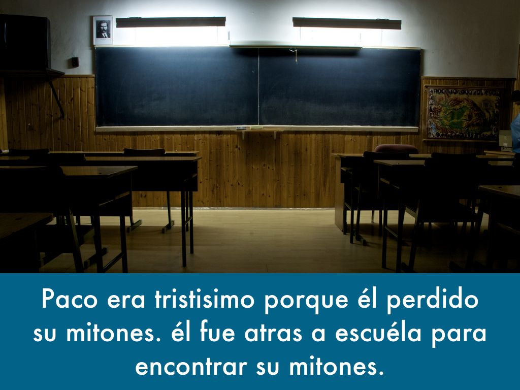 Paco era tristisimo porque él perdido su mitones. él fue atras a escuéla para encontrar su mitones.