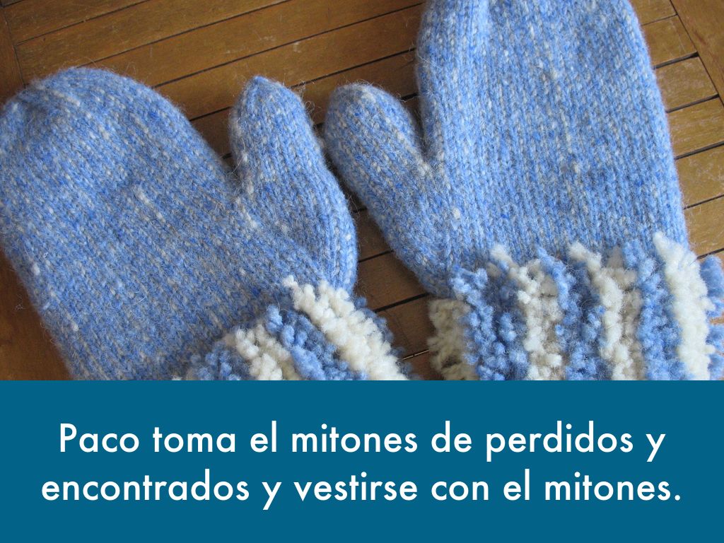 Paco toma el mitones de perdidos y encontrados y vestirse con el mitones.