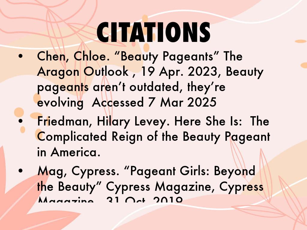 - Chen, Chloe. “Beauty Pageants” The Aragon Outlook , 19 Apr. 2023, Beauty pageants aren’t outdated, they’re evolving Accessed 7 Mar 2025