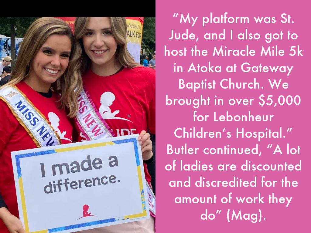 “My platform was St. Jude, and I also got to host the Miracle Mile 5k in Atoka at Gateway Baptist Church. We brought in over $5,000 for Lebonheur Children’s Hospital.” Butler continued, “A lot of ladies are discounted and discredited for the amount of work they do” (Mag).