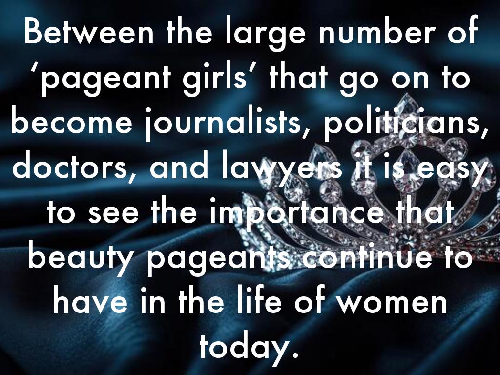 Between the large number of ‘pageant girls’ that go on to become journalists, politicians, doctors, and lawyers it is easy to see the importance that beauty pageants continue to have in the life of women today.