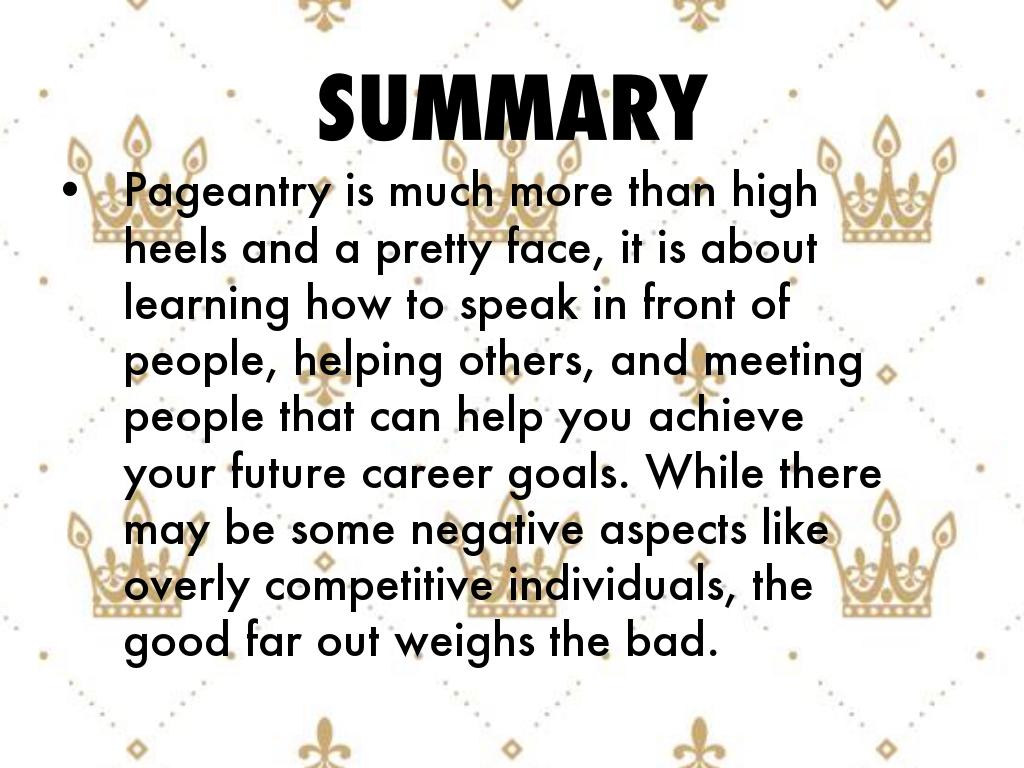 - Pageantry is much more than high heels and a pretty face, it is about learning how to speak in front of people, helping others, and meeting people that can help you achieve your future career goals. While there may be some negative aspects like overly competitive individuals, the good far out weighs the bad.