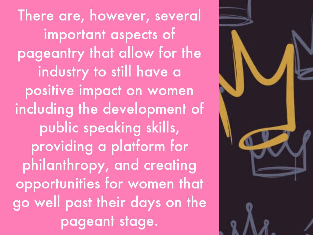 There are, however, several important aspects of pageantry that allow for the industry to still have a positive impact on women including the development of public speaking skills, providing a platform for philanthropy, and creating opportunities for women that go well past their days on the pageant stage.