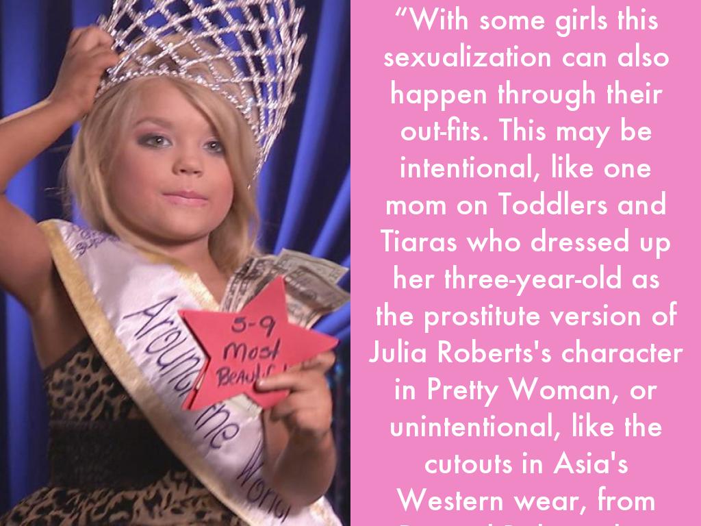 “With some girls this sexualization can also happen through their out-fits. This may be intentional, like one mom on Toddlers and Tiaras who dressed up her three-year-old as the prostitute version of Julia Roberts's character in Pretty Woman, or unintentional, like the cutouts in Asia's Western wear, from Painted Babies, that drew criticism from mother of rival Brooke” (Friedman 163)