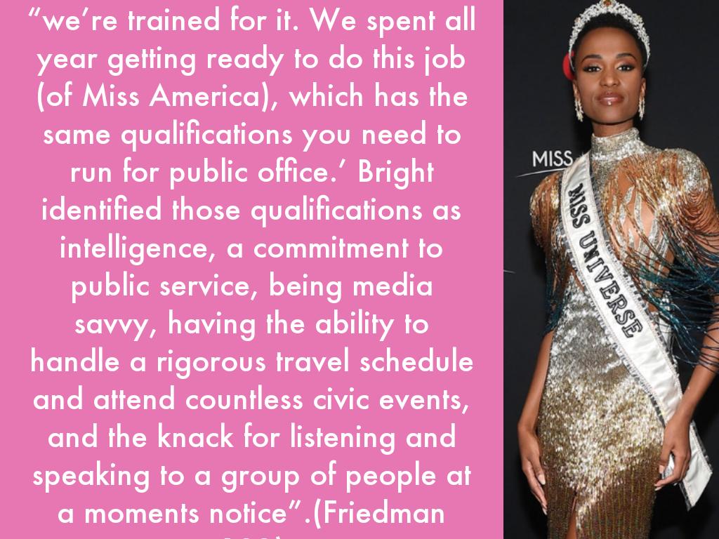 “we’re trained for it. We spent all year getting ready to do this job (of Miss America), which has the same qualifications you need to run for public office.’ Bright identified those qualifications as intelligence, a commitment to public service, being media savvy, having the ability to handle a rigorous travel schedule and attend countless civic events, and the knack for listening and speaking to a group of people at a moments notice”.(Friedman 193)