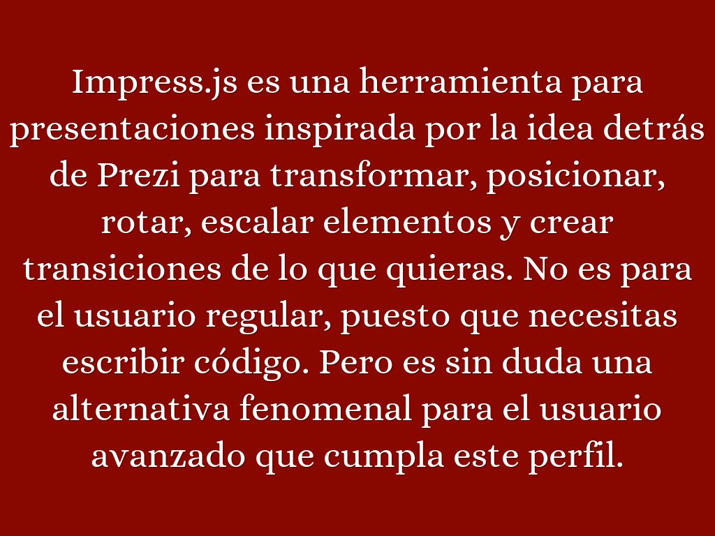 Impress.js es una herramienta para presentaciones inspirada por la idea detrás de Prezi para transformar, posicionar, rotar, escalar elementos y crear transiciones de lo que quieras. No es para el usuario regular, puesto que necesitas escribir código. Pero es sin duda una alternativa fenomenal para el usuario avanzado que cumpla este perfil.