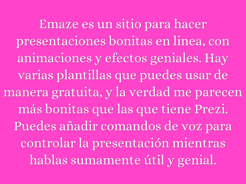 Emaze es un sitio para hacer presentaciones bonitas en linea, con animaciones y efectos geniales. Hay varias plantillas que puedes usar de manera gratuita, y la verdad me parecen más bonitas que las que tiene Prezi. Puedes añadir comandos de voz para controlar la presentación mientras hablas sumamente útil y genial.