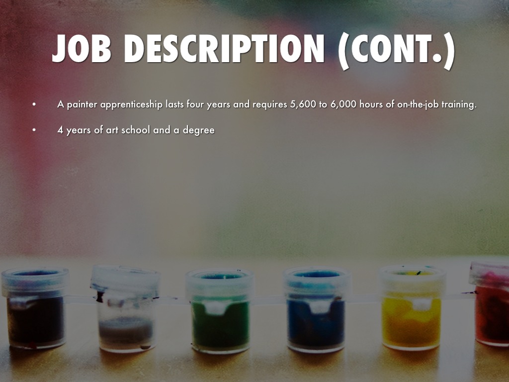 A painter apprenticeship lasts four years and requires 5,600 to 6,000 hours of on-the-job training.