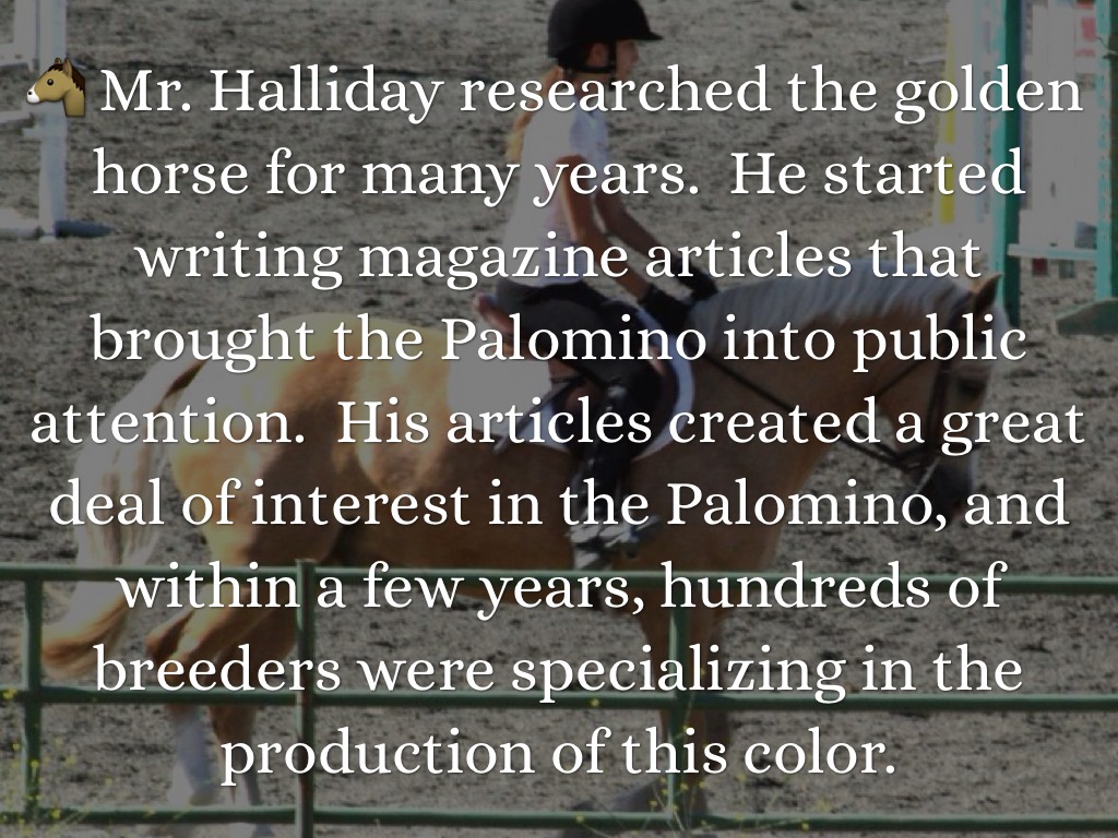 🐴 Mr. Halliday researched the golden horse for many years. He started writing magazine articles that brought the Palomino into public attention. His articles created a great deal of interest in the Palomino, and within a few years, hundreds of breeders were specializing in the production of this color.