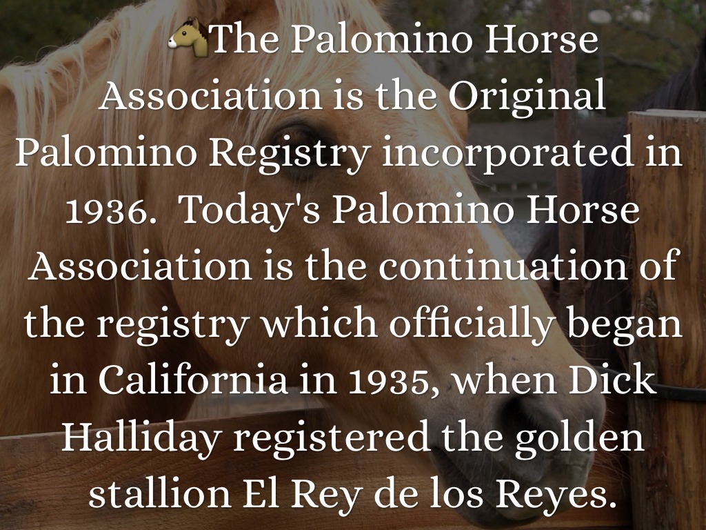 🐴The Palomino Horse Association is the Original Palomino Registry incorporated in 1936. Today's Palomino Horse Association is the continuation of the registry which officially began in California in 1935, when Dick Halliday registered the golden stallion El Rey de los Reyes.
