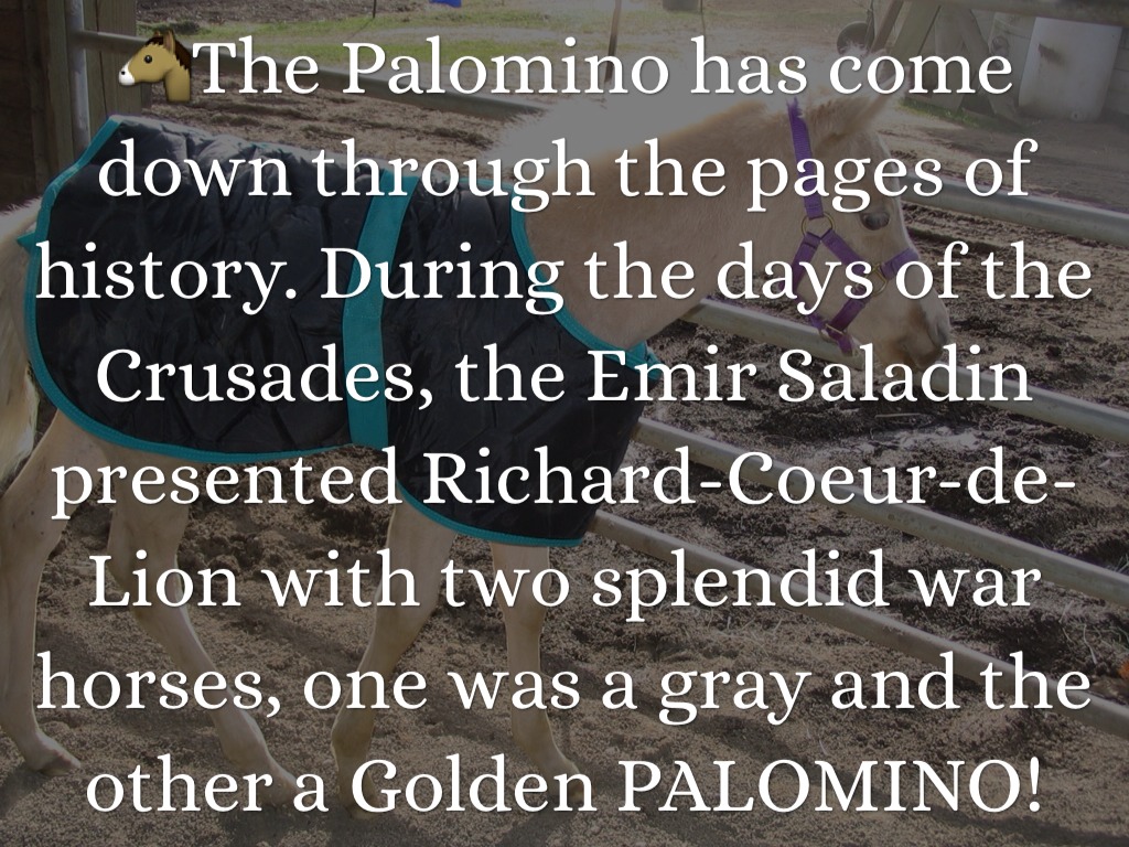 🐴The Palomino has come down through the pages of history. During the days of the Crusades, the Emir Saladin presented Richard-Coeur-de-Lion with two splendid war horses, one was a gray and the other a Golden PALOMINO!