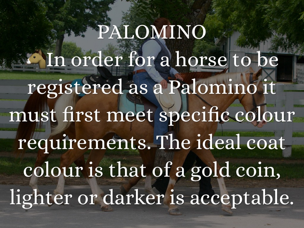 PALOMINO 🐴In order for a horse to be registered as a Palomino it must first meet specific colour requirements. The ideal coat colour is that of a gold coin, lighter or darker is acceptable.
