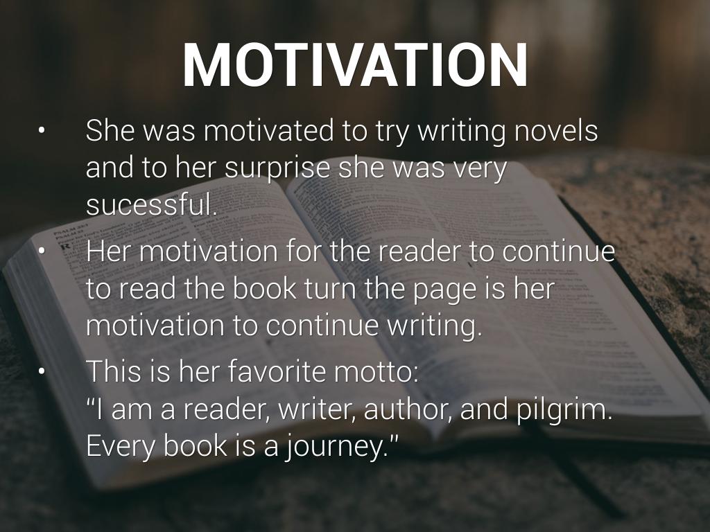 - Her motivation for the reader to continue to read the book turn the page is her motivation to continue writing.