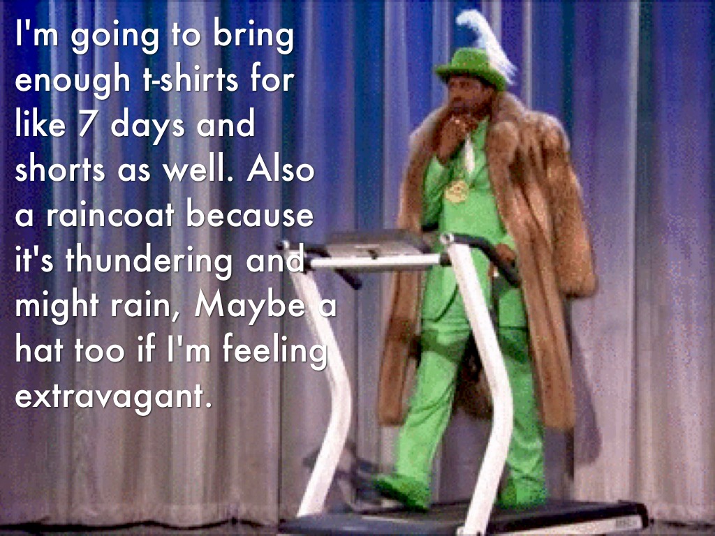 I'm going to bring enough t-shirts for like 7 days and shorts as well. Also a raincoat because it's thundering and might rain, Maybe a hat too if I'm feeling extravagant.